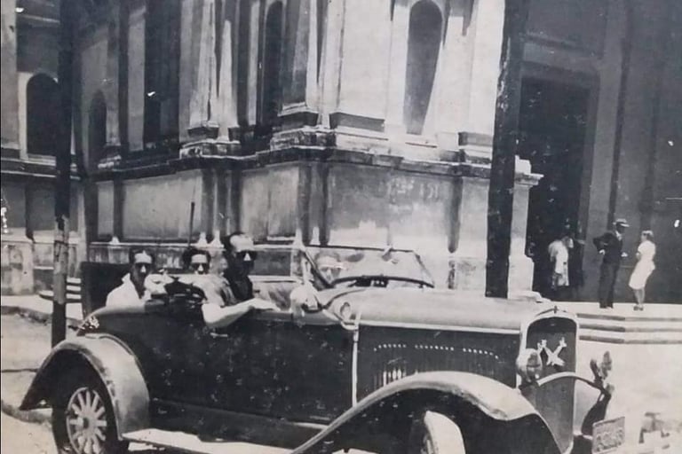 Ainda pela família materna, lembro que restaurei recentemente uma foto da década de 60 do meu avô. Ele estava bem jovem, com alguns amigos no Largo da Matriz. Pinta de playboy, alguns de óculos escuros. Os quatro num Ford, provavelmente fabricado na década de 30. A foto é incrível. Fiquei pensando no que faziam naquele dia. Se buscavam um lugar para beber algo. Se estavam em algum encontro, à procura de uma paquera. Se também era tempo de carnaval. A igreja aparecia lá no fundo, sustentada pelas mesmas colunas, os mesmos portões. As estátuas de São Pedro e São Paulo ainda não estavam ali. Foram colocadas anos depois, talvez para vigiar tudo. Os tempos mudaram. A igreja, que agora se prepara para receber o Carnaval, também se adaptou: o entorno mudou, ergueram grades, mas ela continua viva em sua essência. Caminho por ali com a impressão de que o espectro da minha família ainda circula pelo Largo.